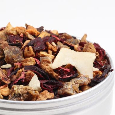 Zutaten: Apfelstücke, Hibiskus, Dattelstücke (Datteln, Trennmittel: Reismehl), Zimtstücke, natürliches Karamellaroma, Nelken, Kokoschips, Kakaoschalen, Hagebuttenschalen.